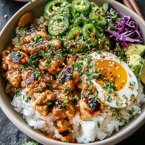 Wenn du die Bowl im Voraus vorbereiten willst, halte die Komponenten getrennt. Reis, Gemüse, Hähnchen und Soße bleiben frisch, wenn sie in einzelnen Behältern im Kühlschrank stehen. So kannst du alles erst kurz vor dem Essen kombinieren.