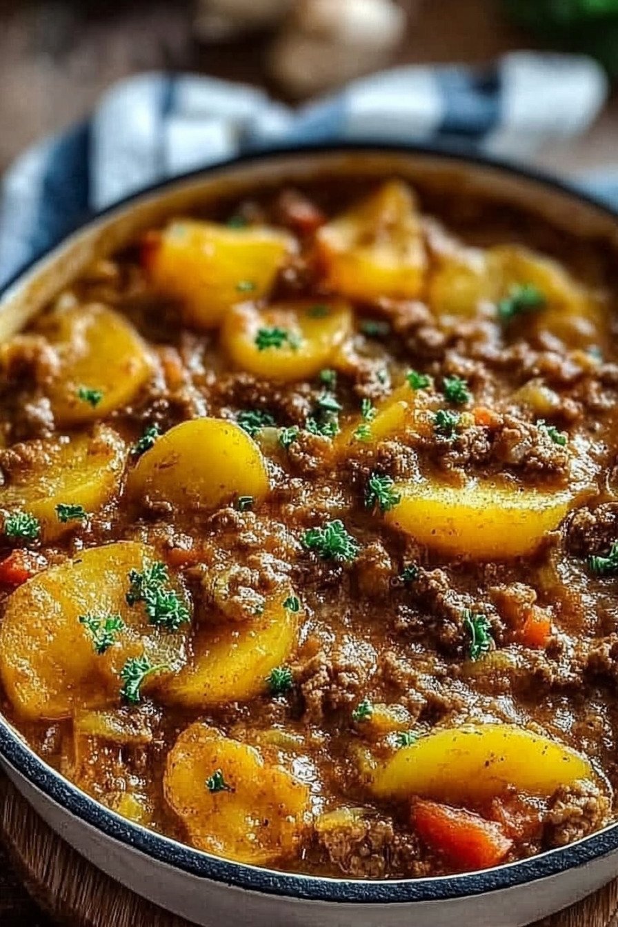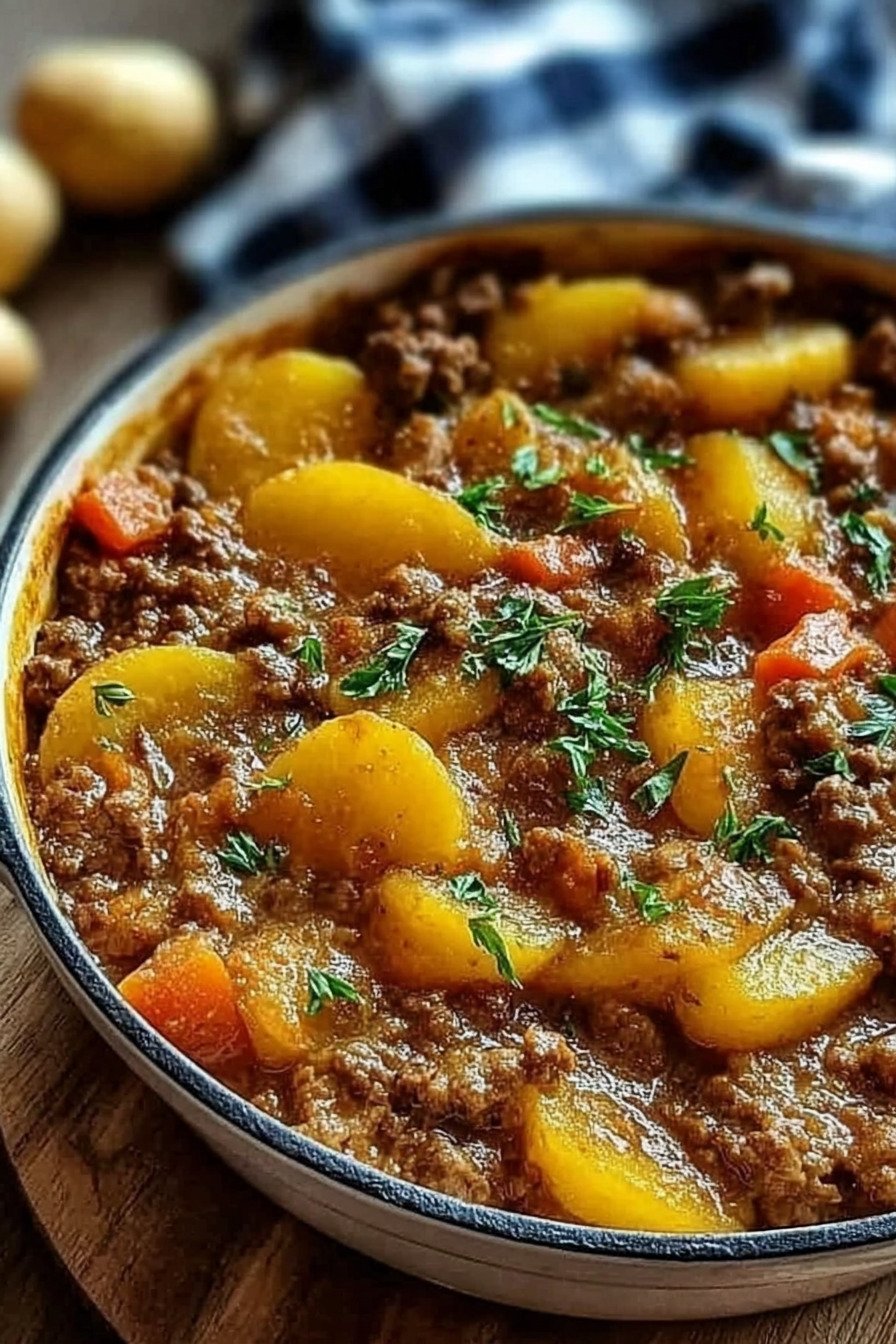Ich brate Hackfleisch an. Zwiebeln und Knoblauch folgen. Tomatenmark liefert Tiefe. Kartoffeln und Paprika tragen Biss. Brühe bindet alles.