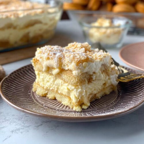 • Ein cremiges Dessert mit Mascarpone, Mandeln und weichen Löffelbiskuits.