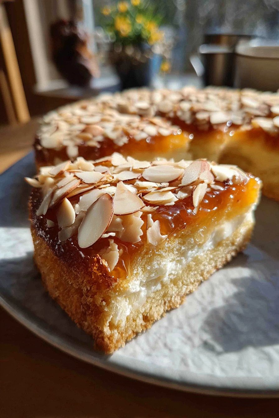 Die Mandelkruste röstet schnell. Am Ende der Backzeit im Blick behalten. Für mehr Glanz etwas Honig in die warme Decke pinseln. Wer Bienenstich liebt, findet mit Bienenstich vom Blech mit Puddingcreme eine bewährte Variante.