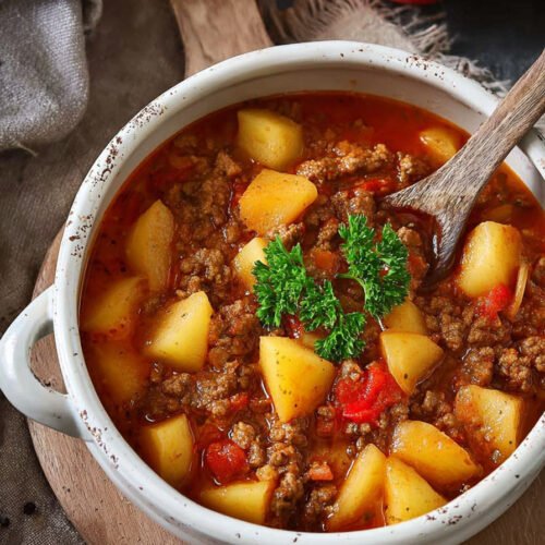 Mit wenigen Handgriffen entsteht eine kräftige Basis, in der Fleisch und Gemüse gemeinsam garen. Diese Methode bringt natürliche Aromen zusammen. Die weichen Kartoffeln und das würzige Hackfleisch fügen sich zu einer harmonischen Mahlzeit, die satt macht und zugleich ein gutes Gefühl hinterlässt. Wer Rezepte mit Fleisch sucht, entdeckt hier eine runde Lösung.