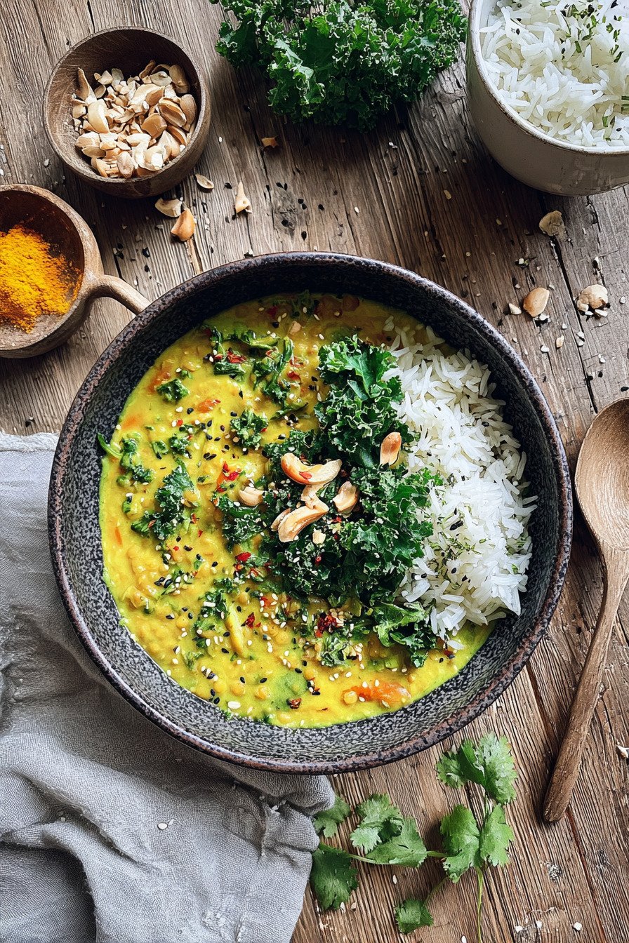 Bei diesem Curry verbinden sich gelbe Linsen, Kokosmilch und frischer Grünkohl zu einem sanften Gericht. Die Würze bleibt klar. Die Konsistenz wirkt cremig und angenehm.