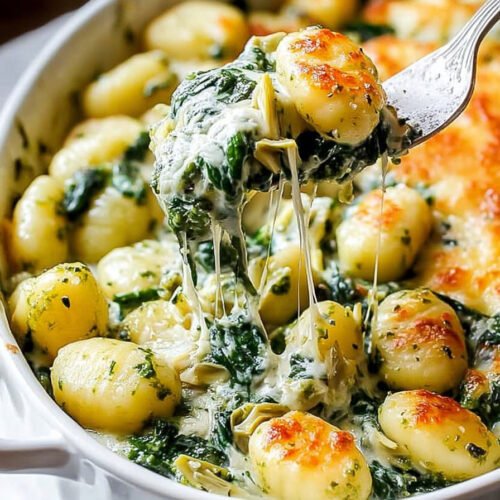 Der Duft von Knoblauch steigt aus der Form, der Käse schmilzt sanft, die Gnocchi nehmen jede Spur der cremigen Soße auf. Wer Gerichte Mit Gnocchi liebt, findet hier eine runde Mischung aus Frische und Wärme. Spinat bringt Farbe, Artischocken geben Tiefe, und die Gnocchi bleiben weich mit leichtem Biss.
