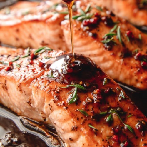 Dieser Honigglasierte Lachs vereint zarte, saftige Fischfilets mit einer süß-herzhaften Glasur, die im Ofen perfekt karamellisiert. Die Kombination aus Honig, Sojasauce und frischem Knoblauch schafft ein unwiderstehliches Aroma, das jeden Bissen zu einem kleinen Fest macht. Lachs ist reich an wertvollen Omega-3-Fettsäuren, die Herz und Gehirn unterstützen. In dieser Rezeptvariante wird er mit minimalem Aufwand zubereitet, wodurch er sich sowohl für ein schnelles Abendessen als auch für ein besonderes Dinner eignet. Durch die kurze Garzeit bleibt das Fleisch saftig und der Geschmack intensiv. Serviert mit einer leichten Gemüsebeilage oder frischem Salat wird dieses Gericht zu einer vollwertigen Mahlzeit. Die ausgewogene Mischung aus süß, salzig und leicht pikant macht den Honigglasierten Lachs zu einem Lieblingsrezept für die ganze Familie.
