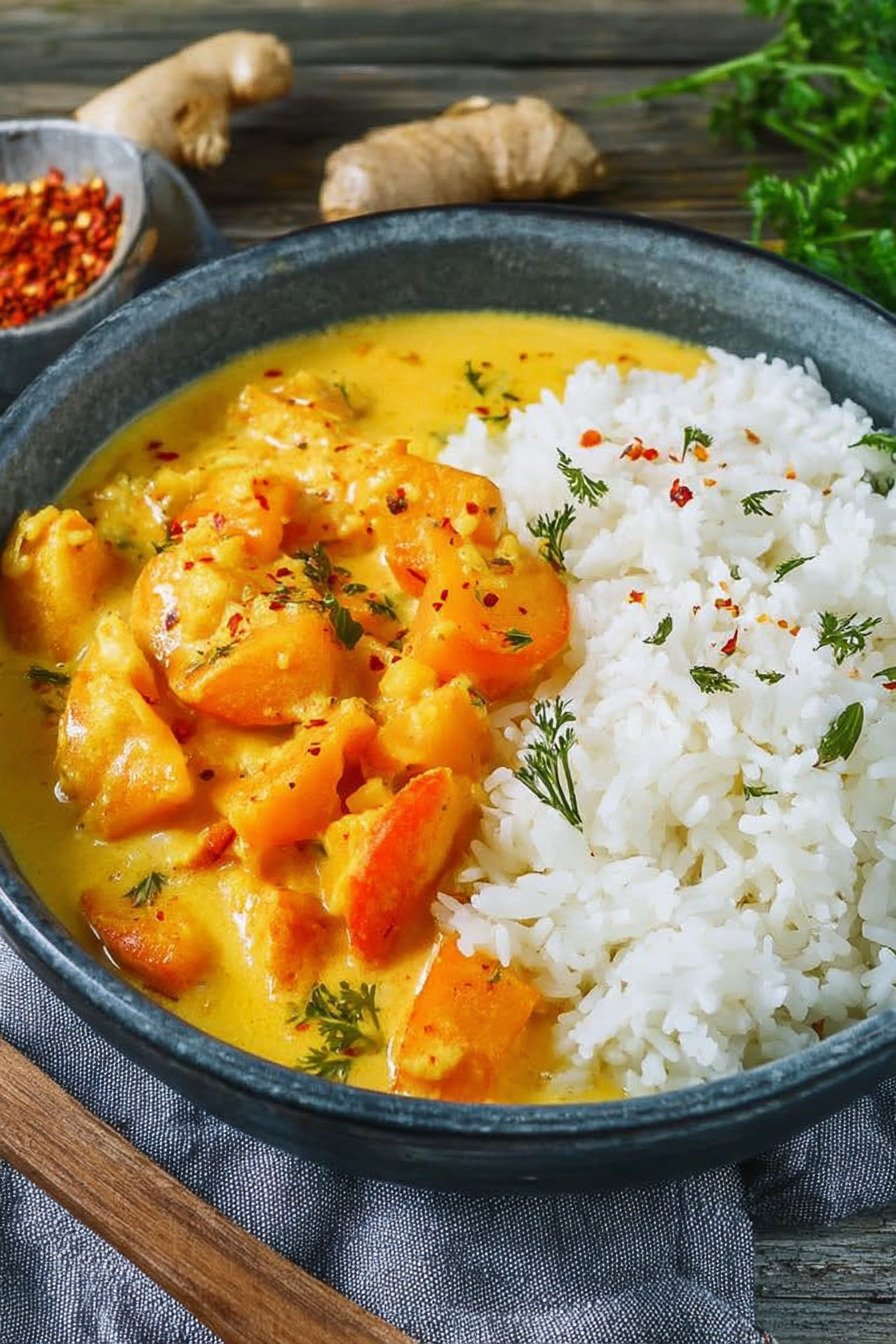 Kokosmilch schafft die cremige Basis. Sie verbindet die Gewürze und rundet die Süße des Kürbis. Die Sauce bleibt weich und trägt den Reis.