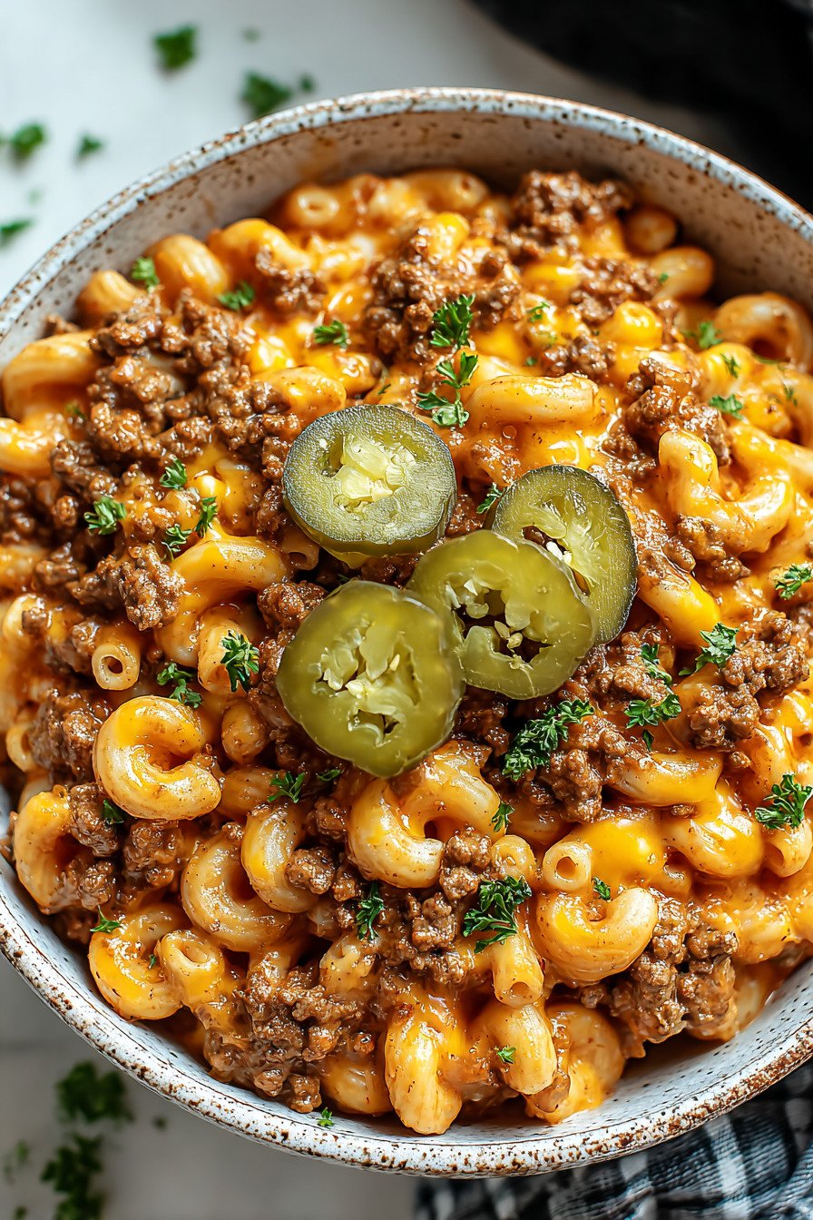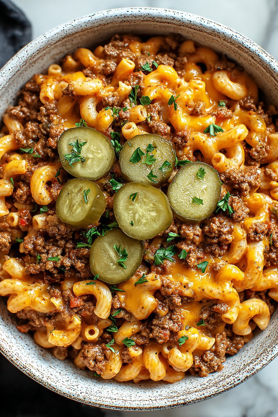 Rinderhackfleisch sorgt für den typischen Cheeseburger-Geschmack und bringt eine herzhafte Tiefe in dieses Onepot Rezepte Gericht.