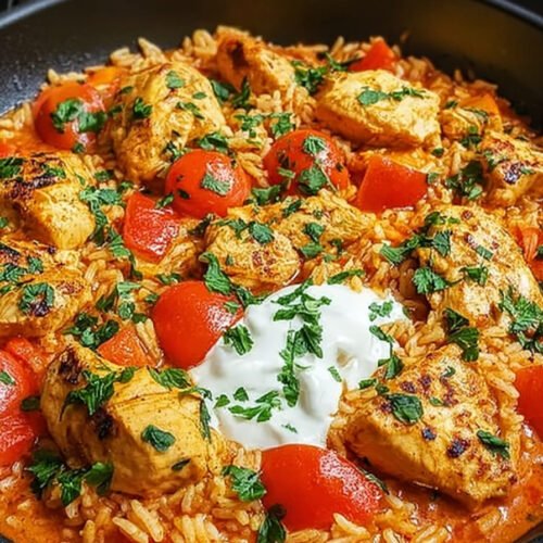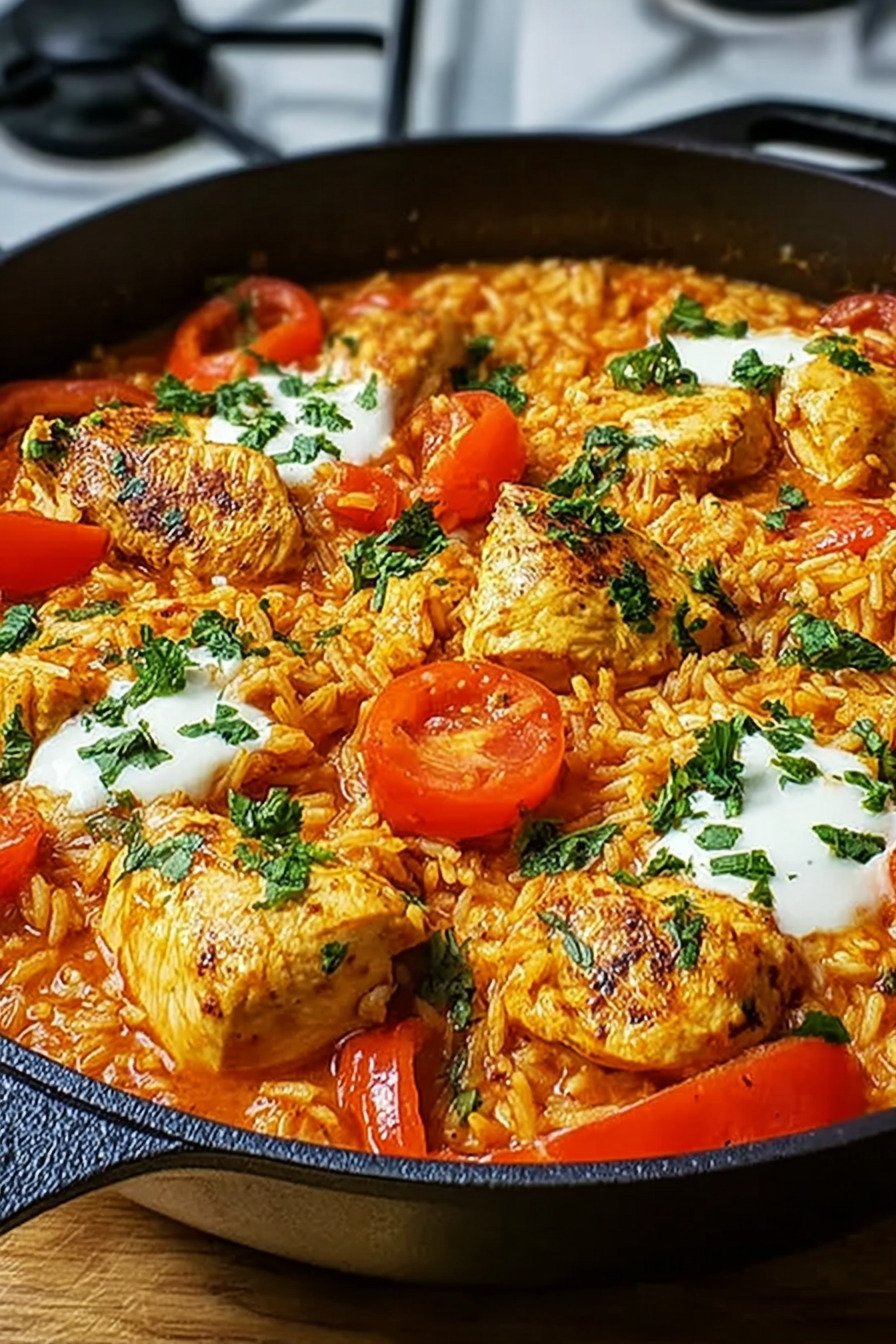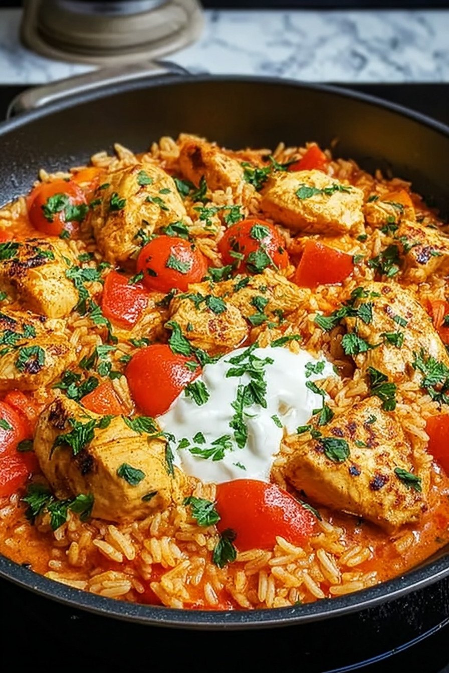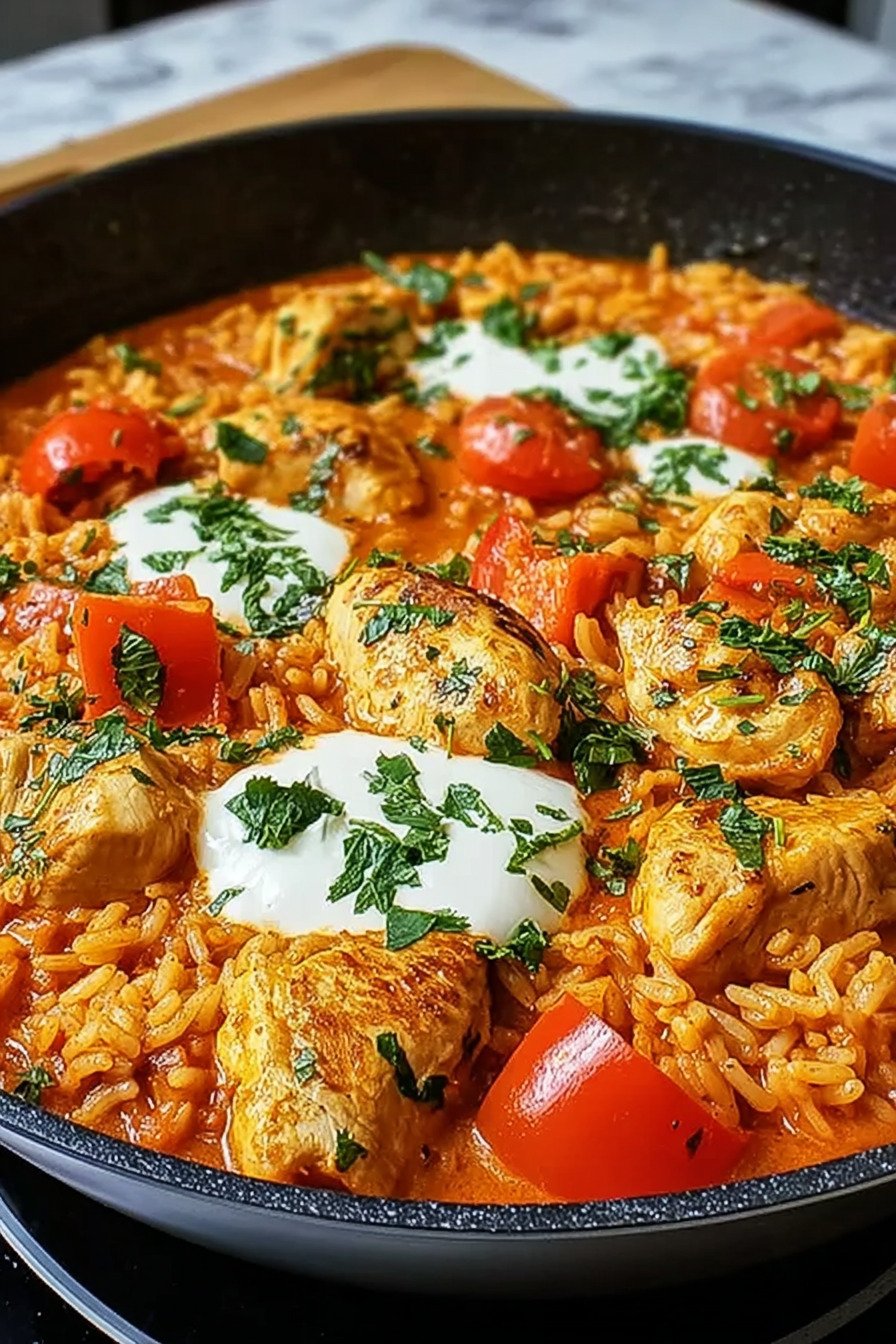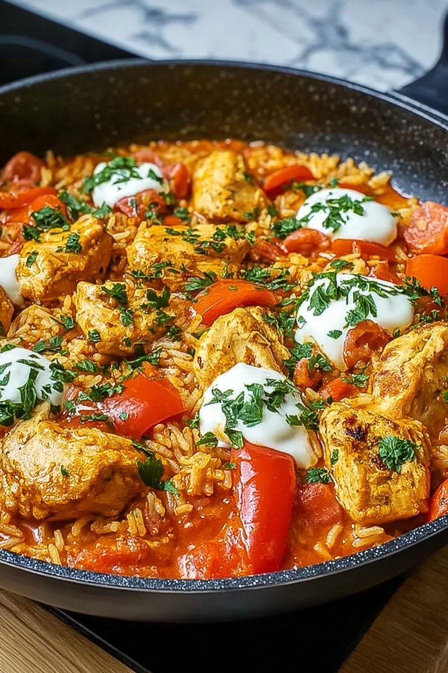Dieses Gericht setzt auf kurze Wege zwischen Pfanne Teller und Genuss. Zartes Hähnchen trifft auf süße Paprika und lockeren Reis. Die Soße bindet mild und cremig.