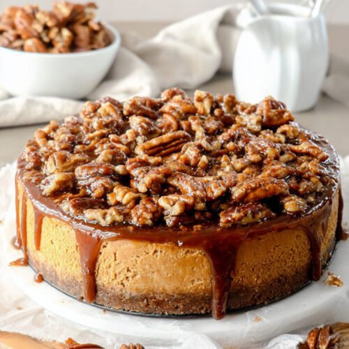 - Karamell-Pekannuss-Mischung auf den gekühlten Cheesecake geben und servieren.