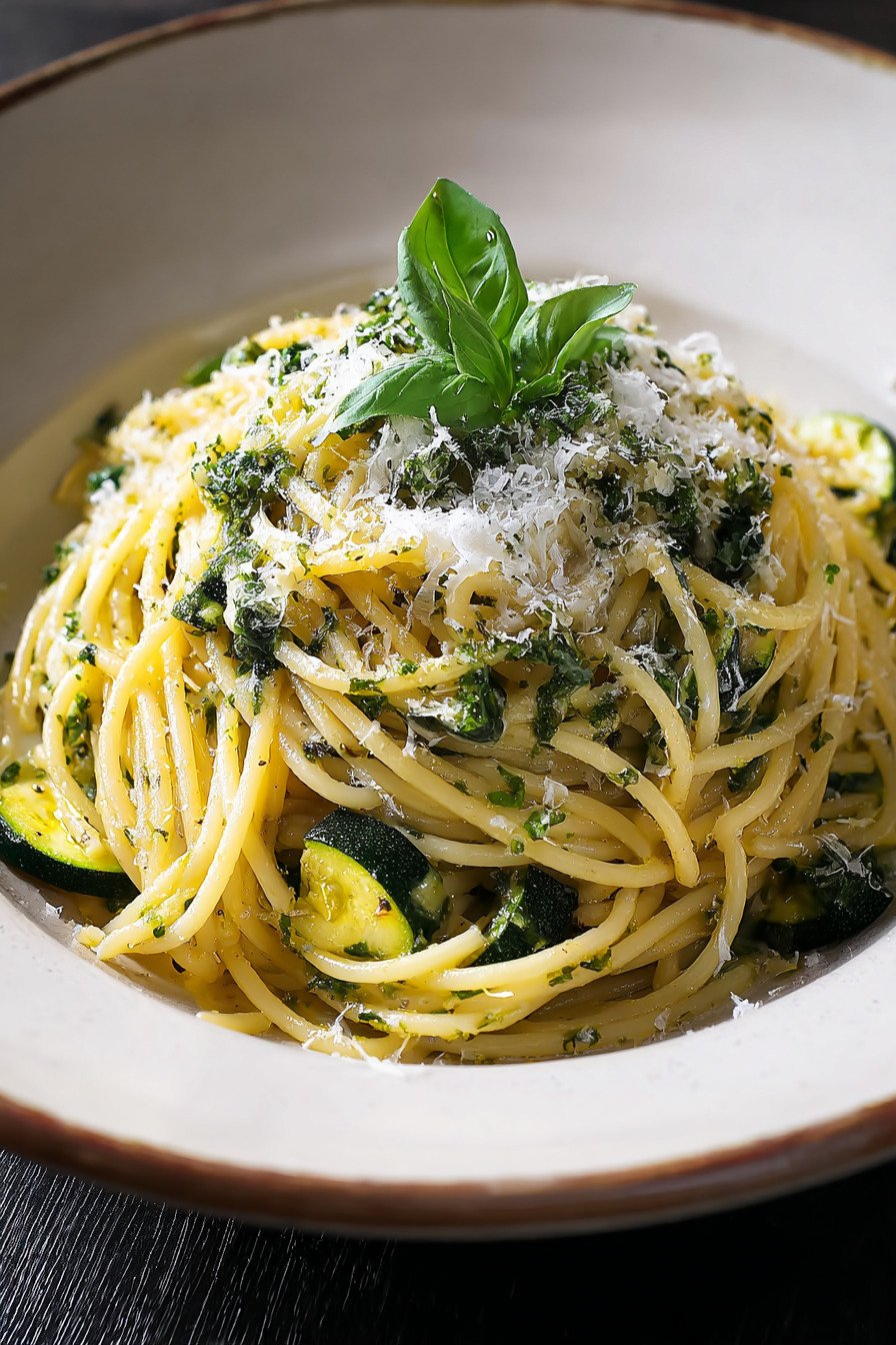 - Cremige Sauce aus Zucchini und Käse verbindet sich mit al dente Spaghetti.