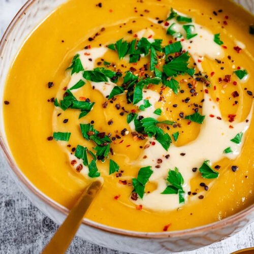 - Suppe fein pürieren und mit Salz und Pfeffer abschmecken. Nach Wunsch mit etwas Kokosmilch, Sesam, Chili und Kräutern servieren.