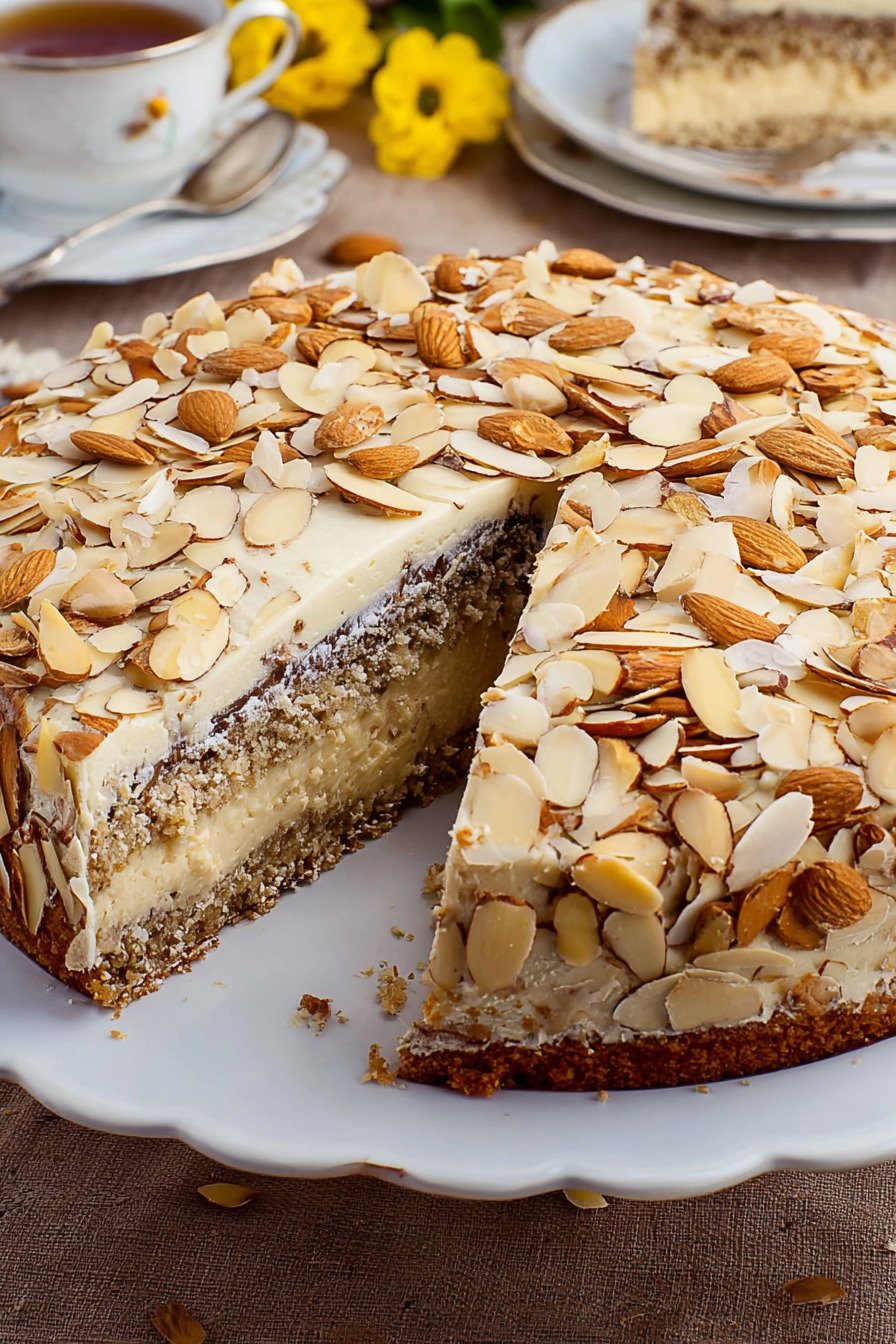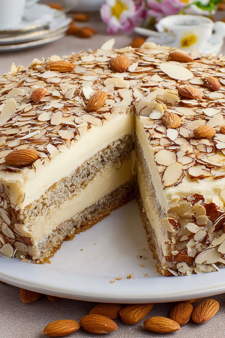 Diese Torte zeigt klare Schritte und milde Aromen. Der Boden trägt Mandel duftet warm und bleibt saftig. Die Creme ruht sanft und wirkt glatt. Das Ergebnis passt zu Gästen und zu ruhigen Nachmittagen.