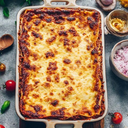 Die Bolognese kannst du am Vortag kochen. Gekühlt zieht sie an und gewinnt an Tiefe. Vor dem Schichten kurz erwärmen, dann verteilt sie sich gleichmäßig und lässt sich gut streichen.