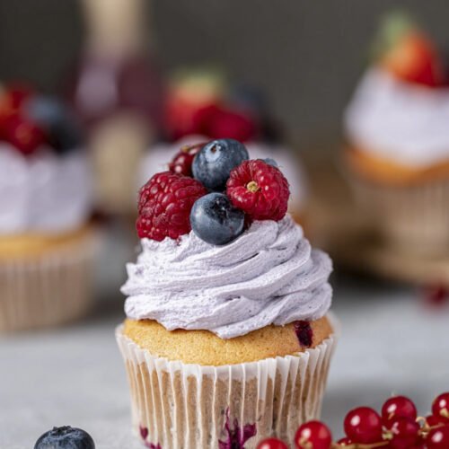 - Cupcakes mit Beeren dekorieren und bis zum Servieren kühlen.